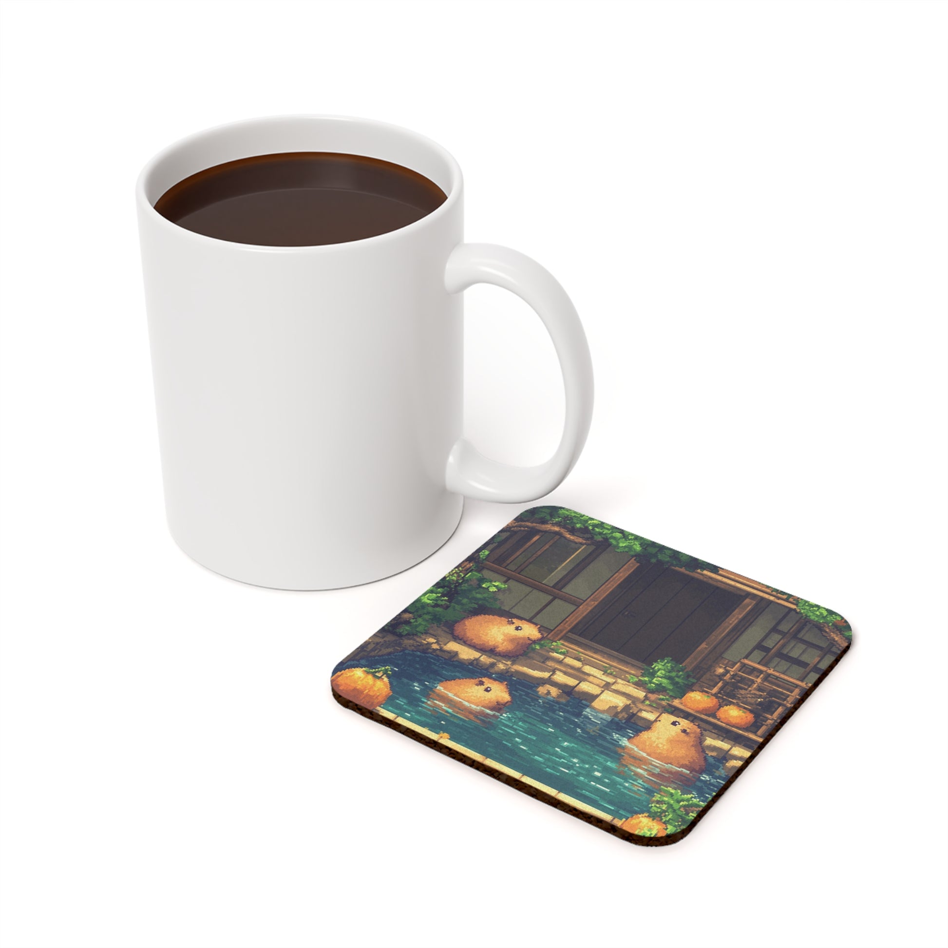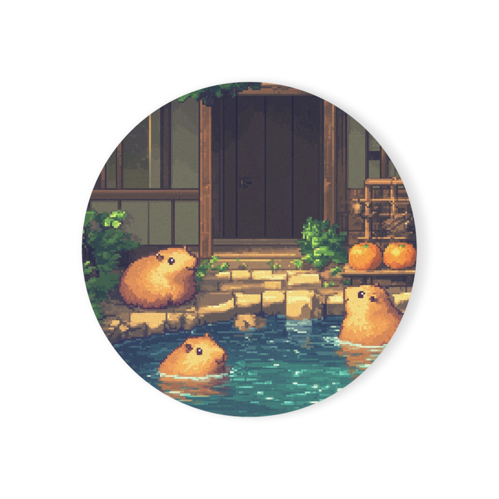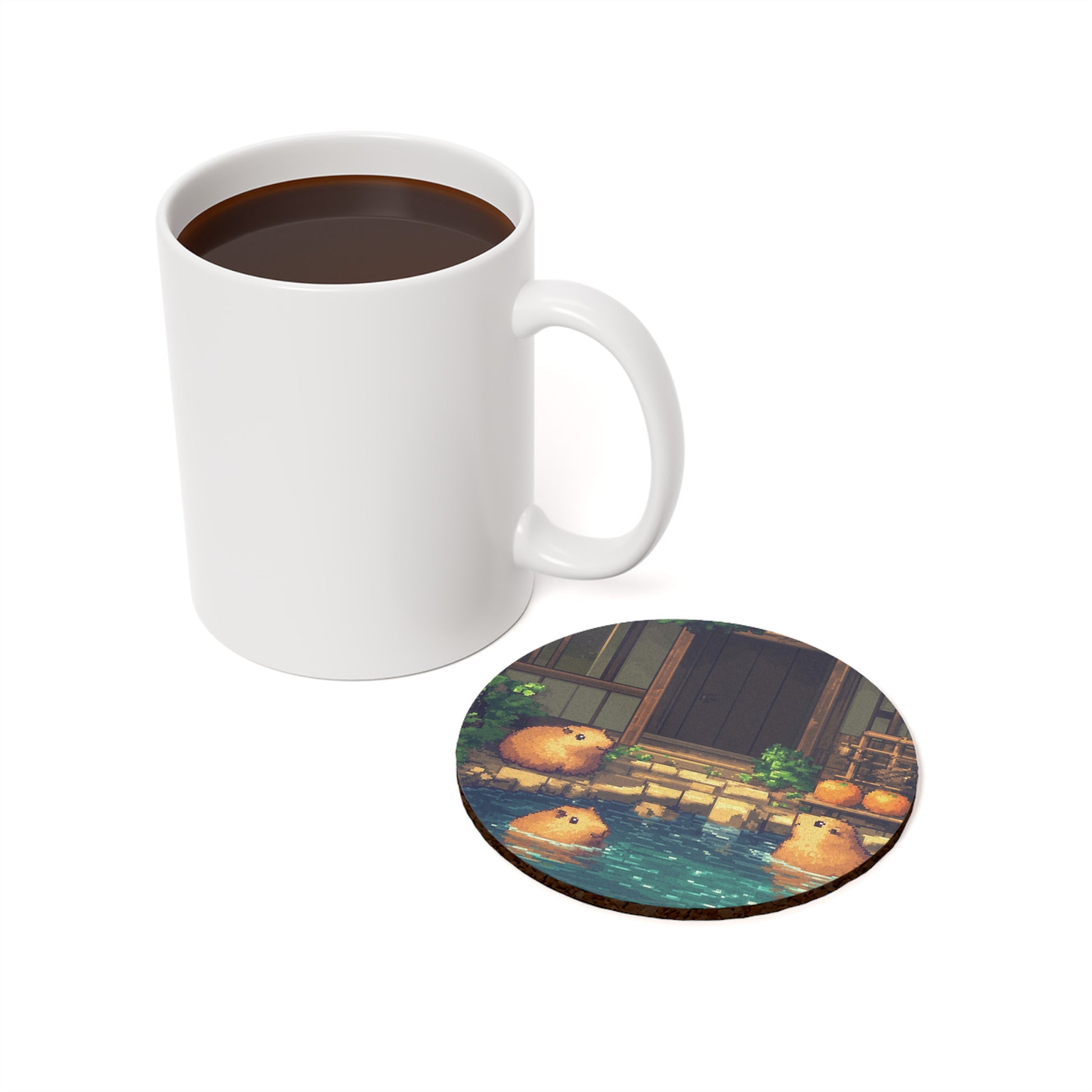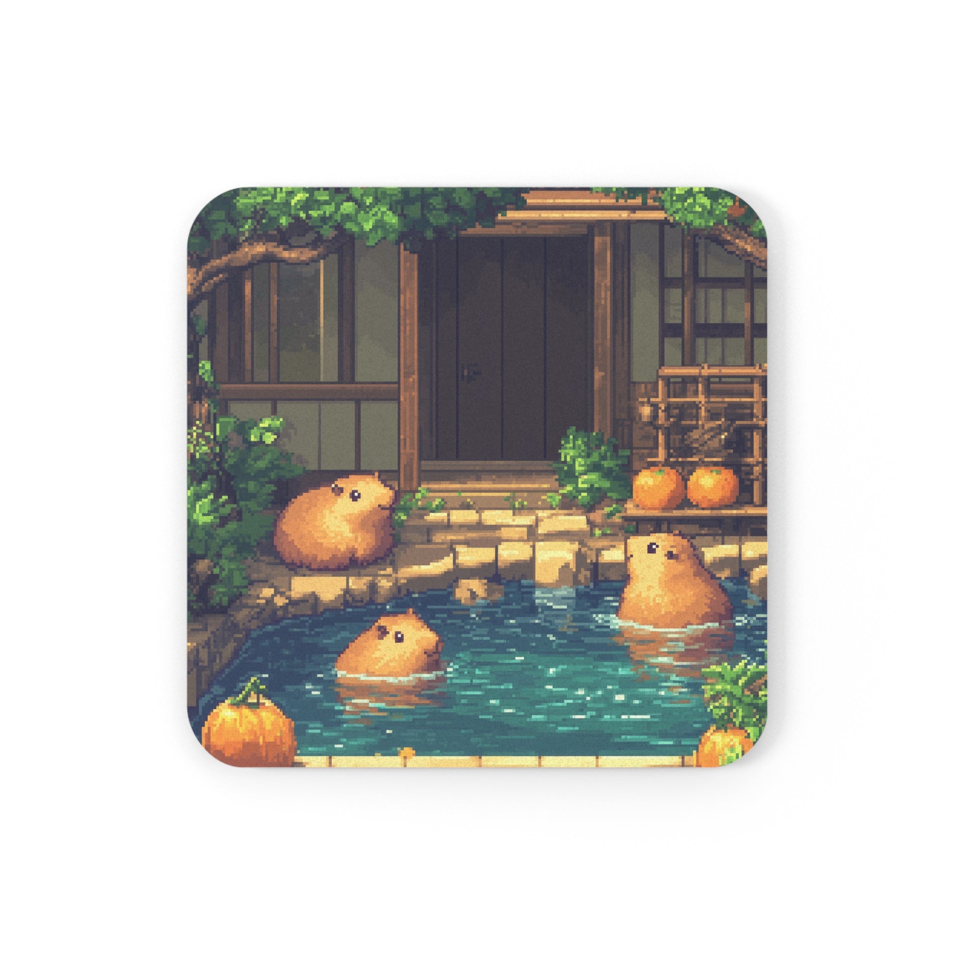 Bring a touch of cozy cuteness to your space with our Cork Back Coaster featuring Pixel Art Kawaii Capybaras! This adorable coaster shows three capybaras soaking in a hot tub outside a charming Japanese-style house, surrounded by juicy oranges and soft, soothing colors. It's the perfect way to add a calm and kawaii atmosphere to your table.