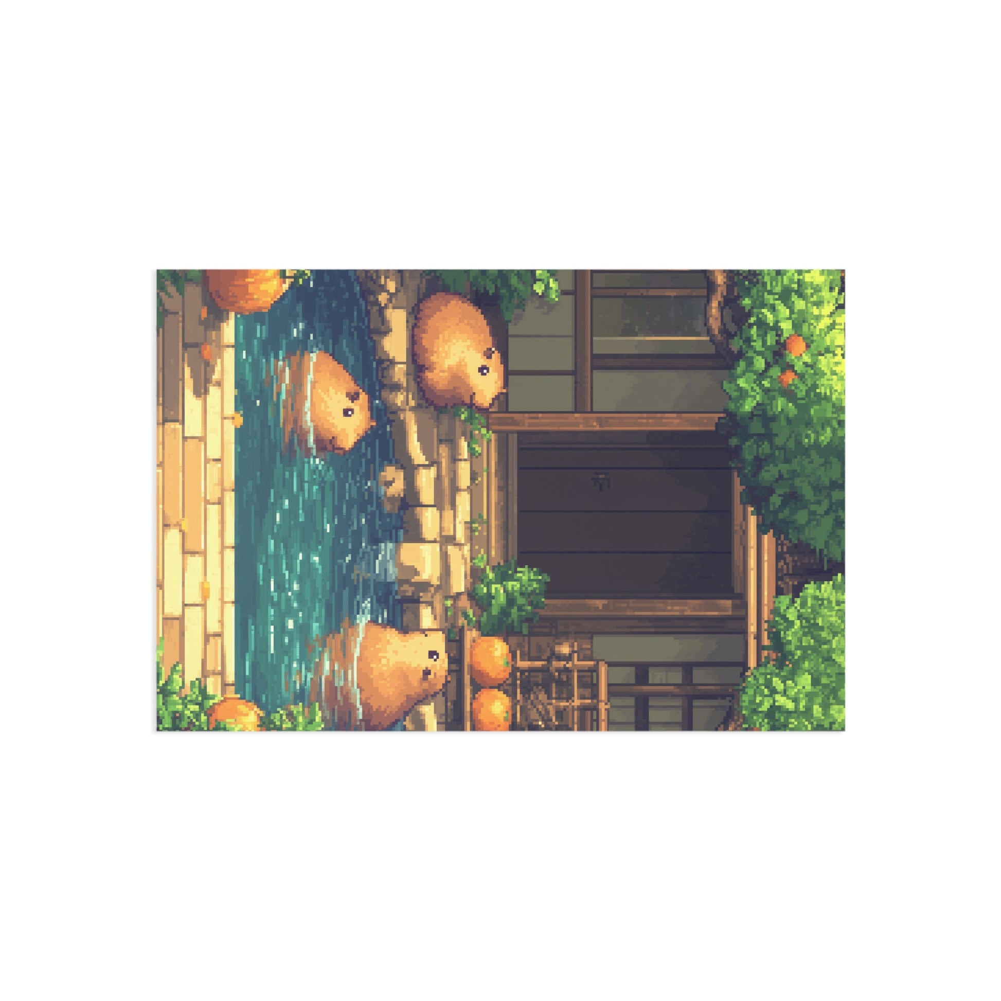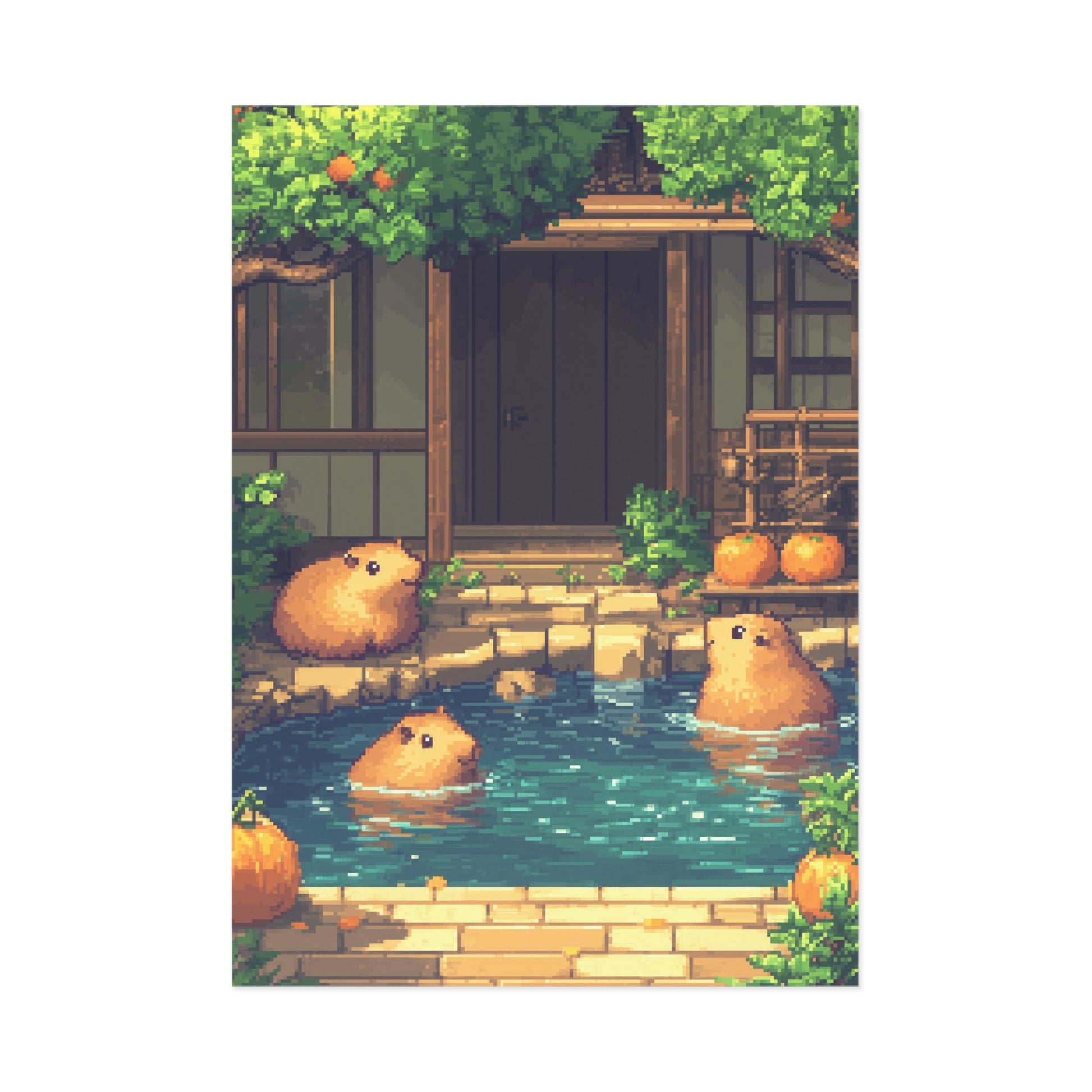 - Cute pixel art of capybaras enjoying a relaxing hot tub surrounded by vibrant oranges