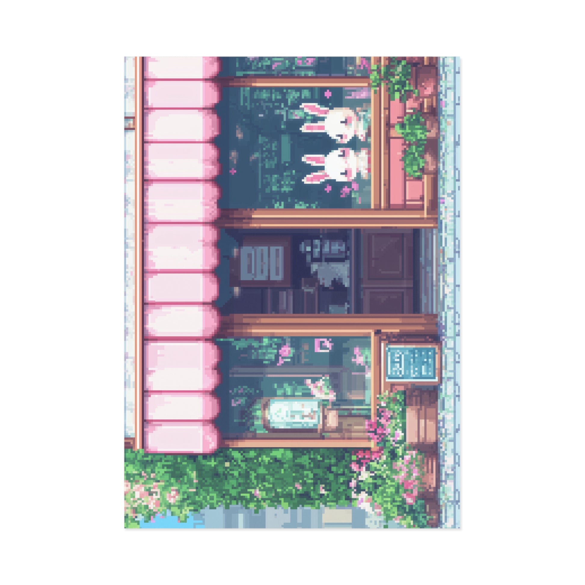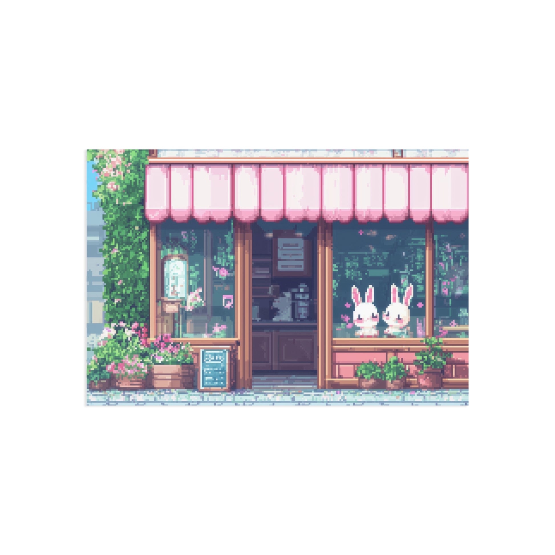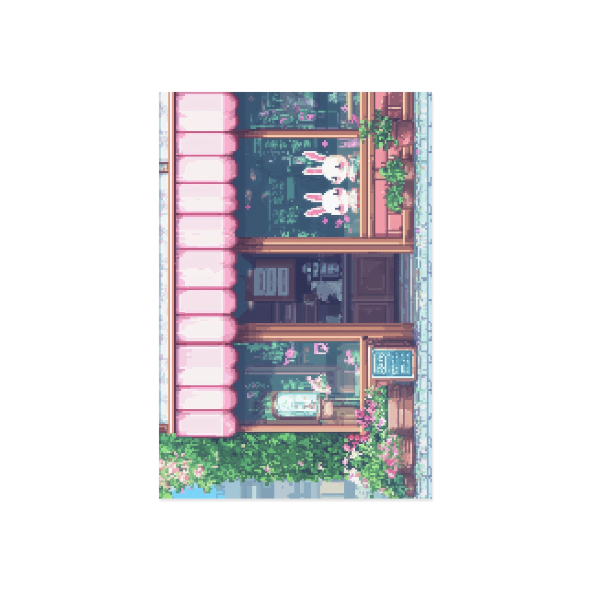 - Cute pixel art of two bunnies enjoying a charming café with soft, happy colors