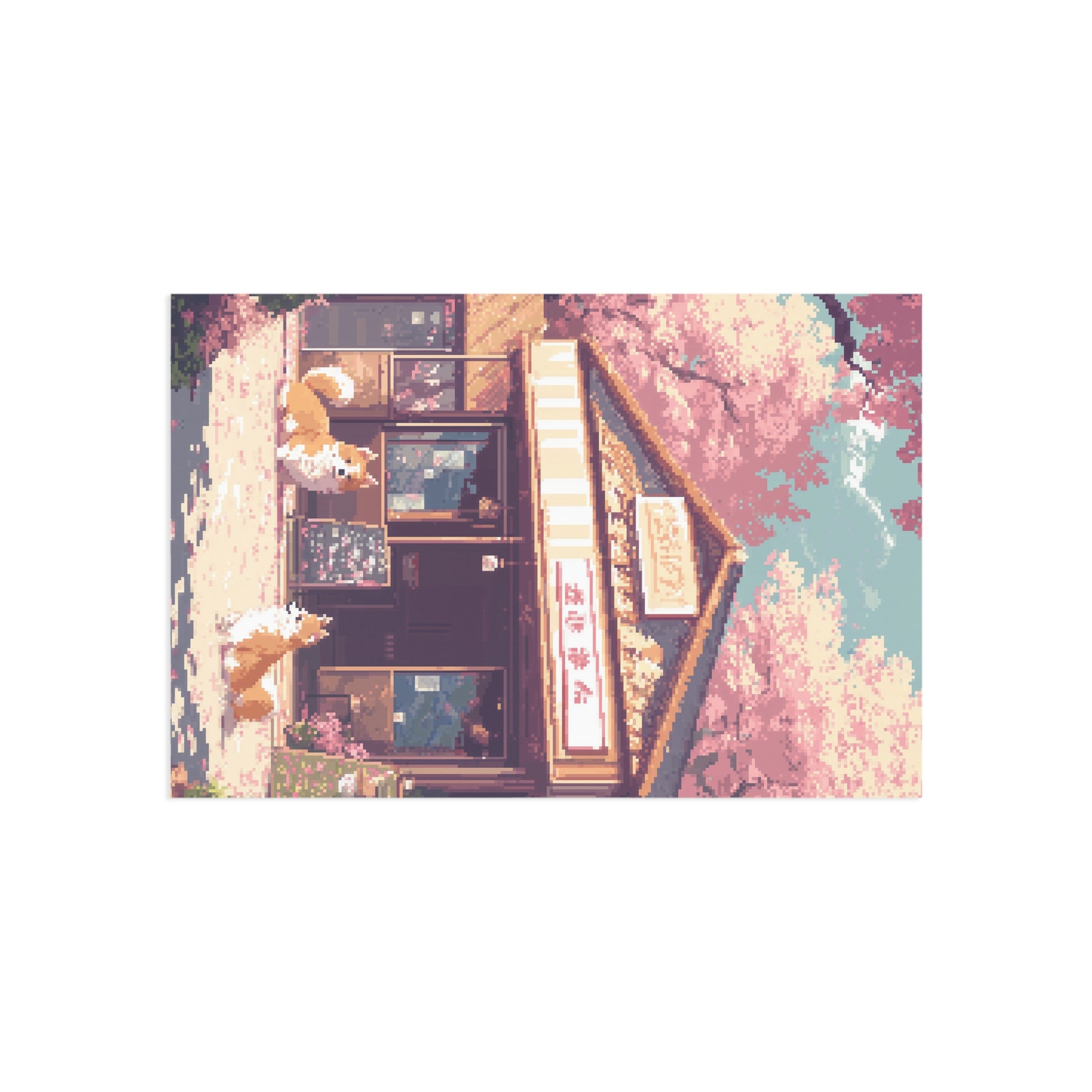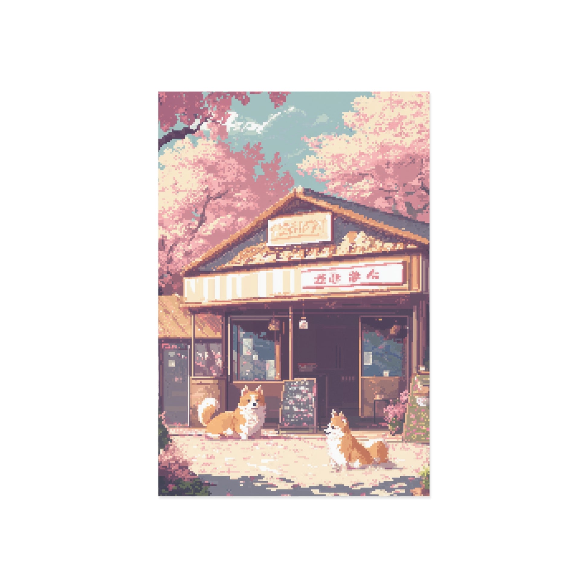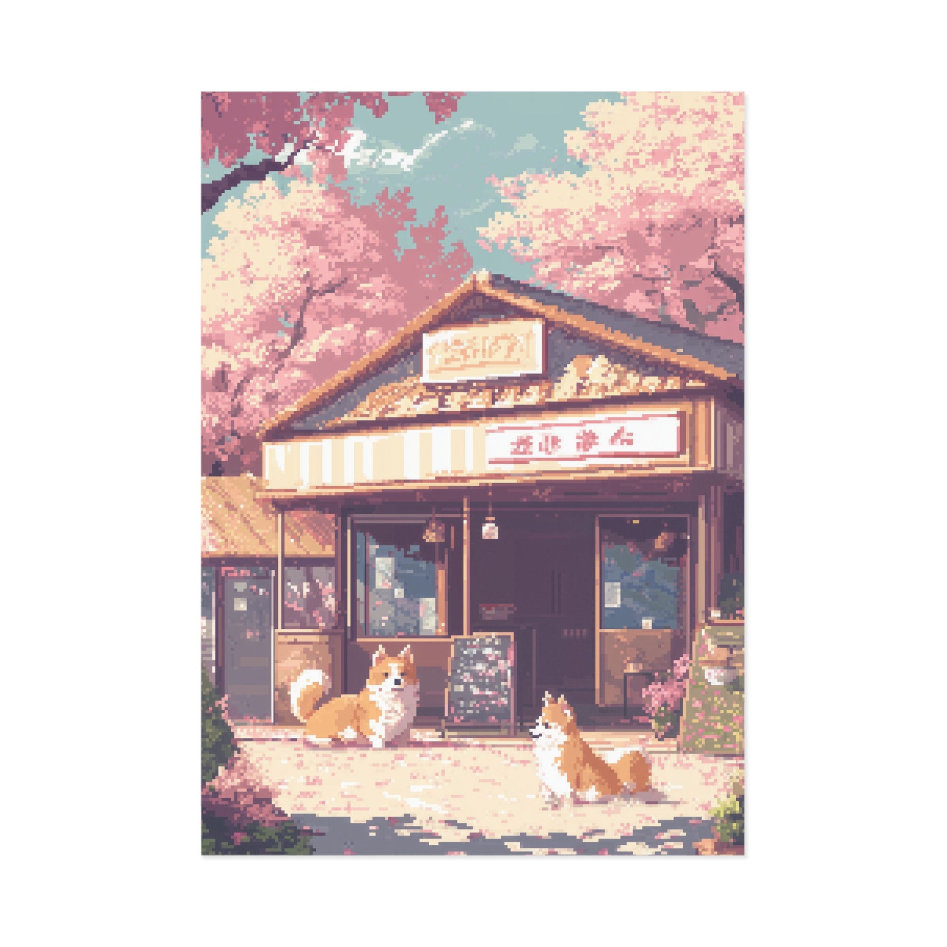- Cute pixel art of a charming Japanese cafe surrounded by sakura trees and two adorable dogs