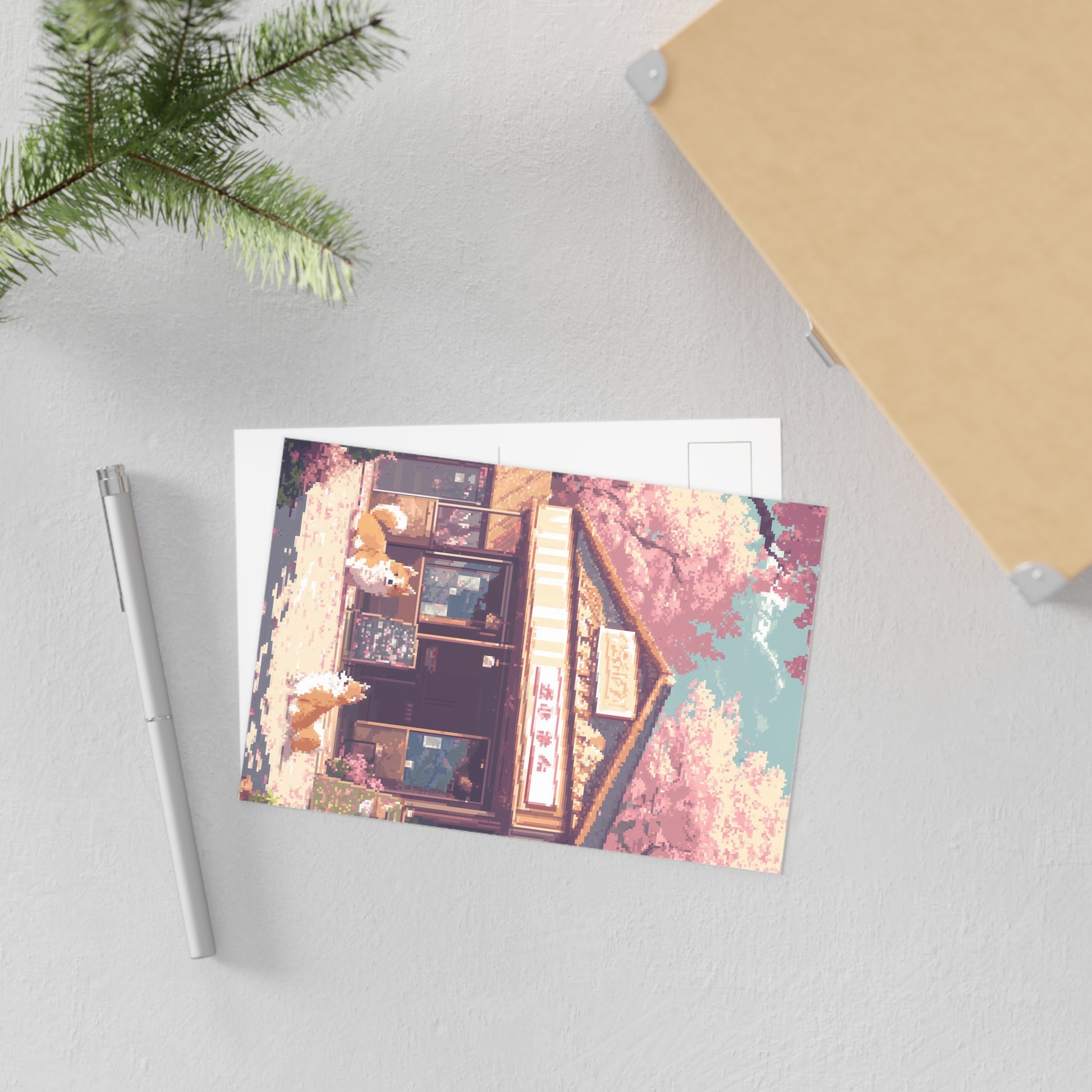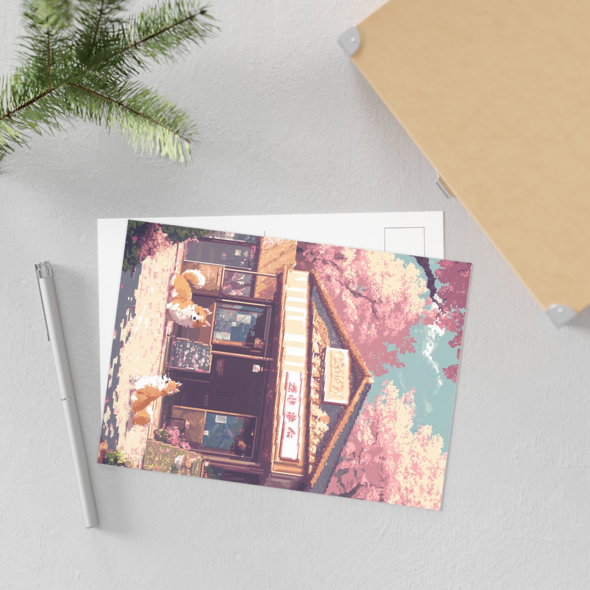 Send a burst of charm with our "Charming Café" Postcards! Featuring an adorable cafe surrounded by blooming sakura trees, with two cute dogs happily standing in front, these postcards radiate warmth and cozy vibes. The soft pastel pinks and yellows create a delightful, peaceful atmosphere that’s perfect for sharing love and happiness.