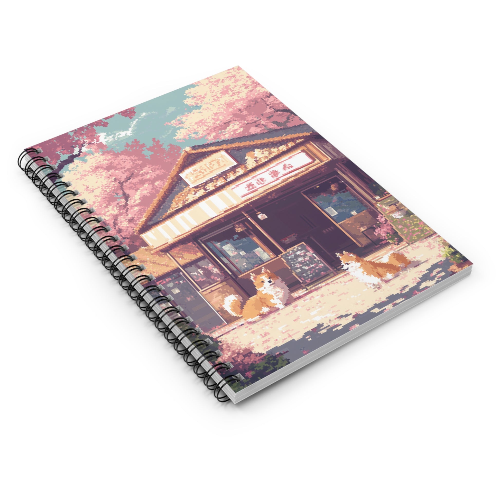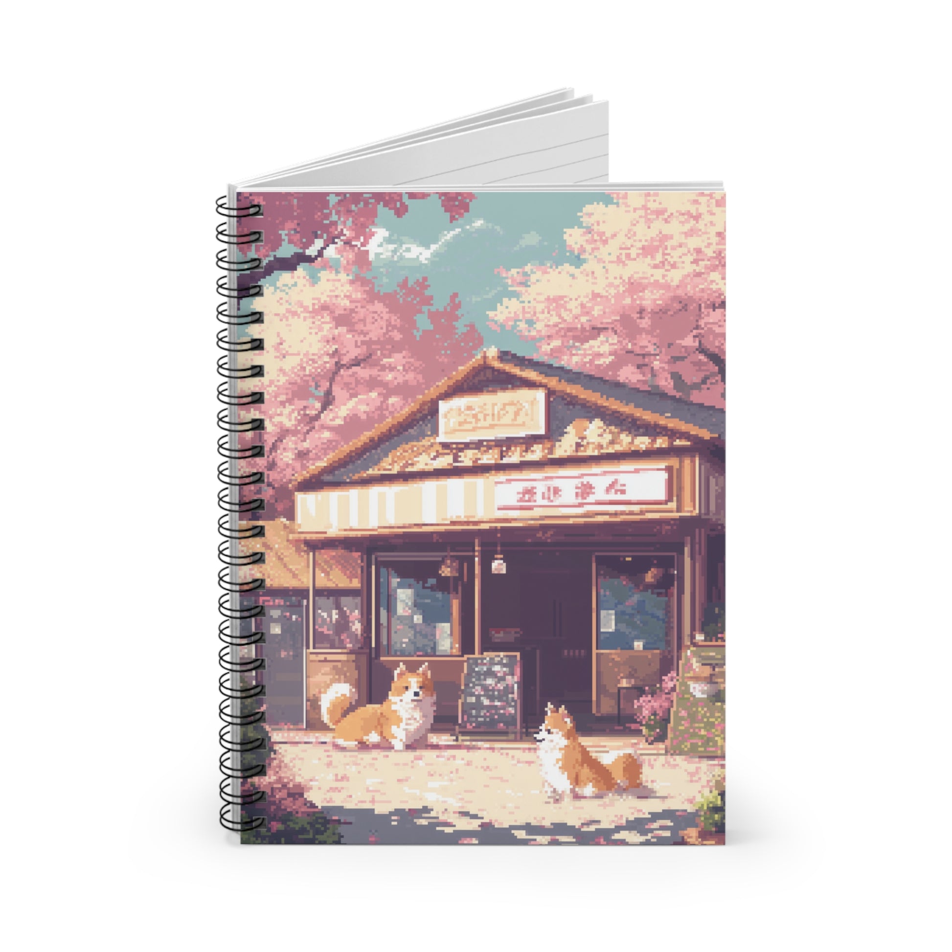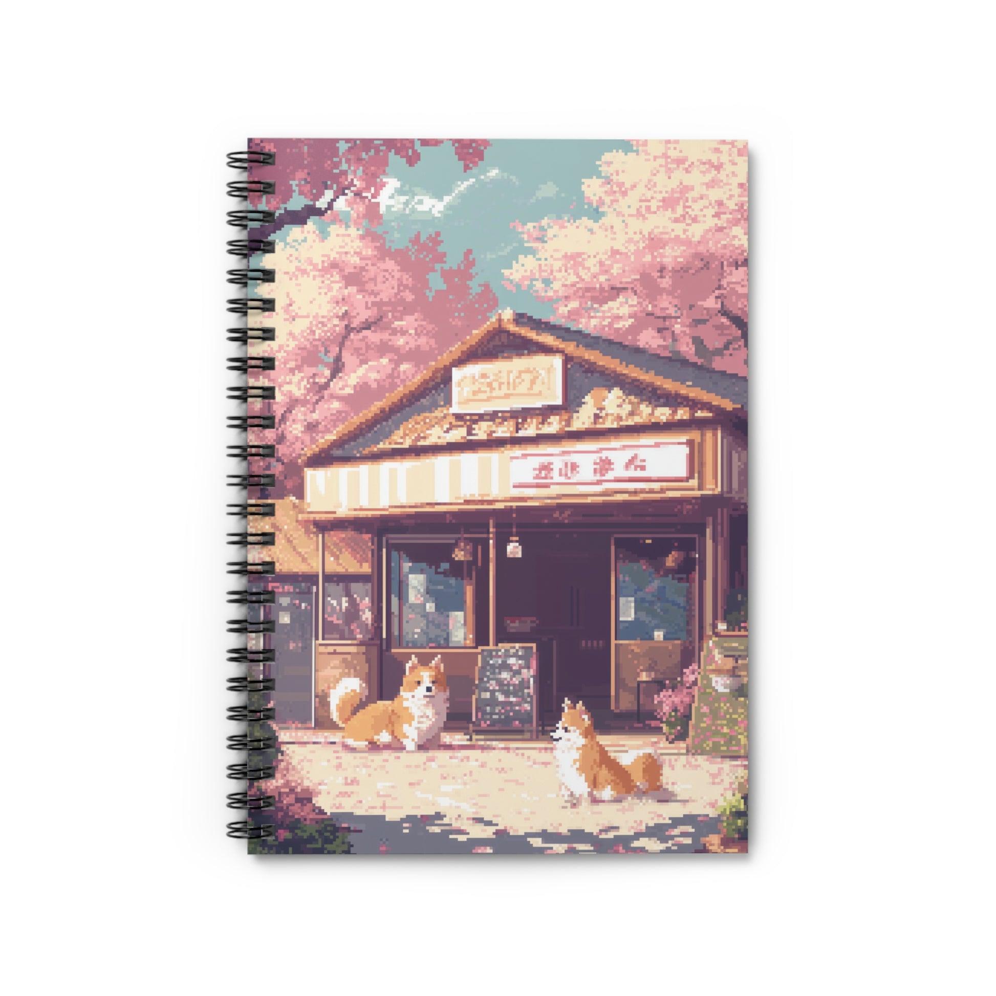 Step into a dreamy slice of Japan with our "Charming Café" Spiral Notebook - Ruled Line! This enchanting design features a charming little café surrounded by blooming cherry blossoms, with two adorable pups waiting out front—ready to greet you with pure cuteness! With soft pastel pinks and warm yellows, this notebook is the perfect blend of cozy and kawaii, making every note, doodle, or daydream feel extra special.