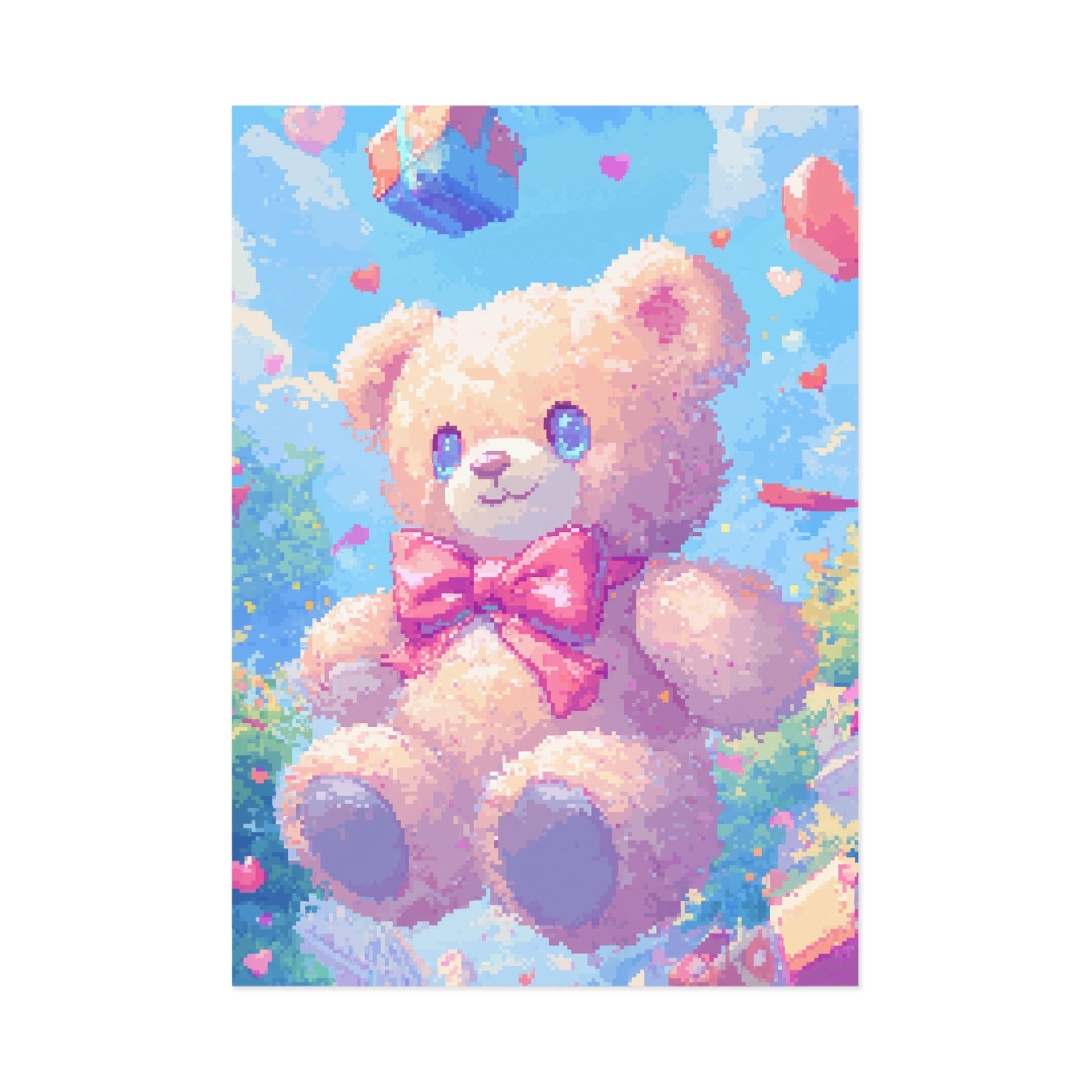 - Adorable pixel art of a cute teddy floating in a dreamy sky with pastel pinks and blues