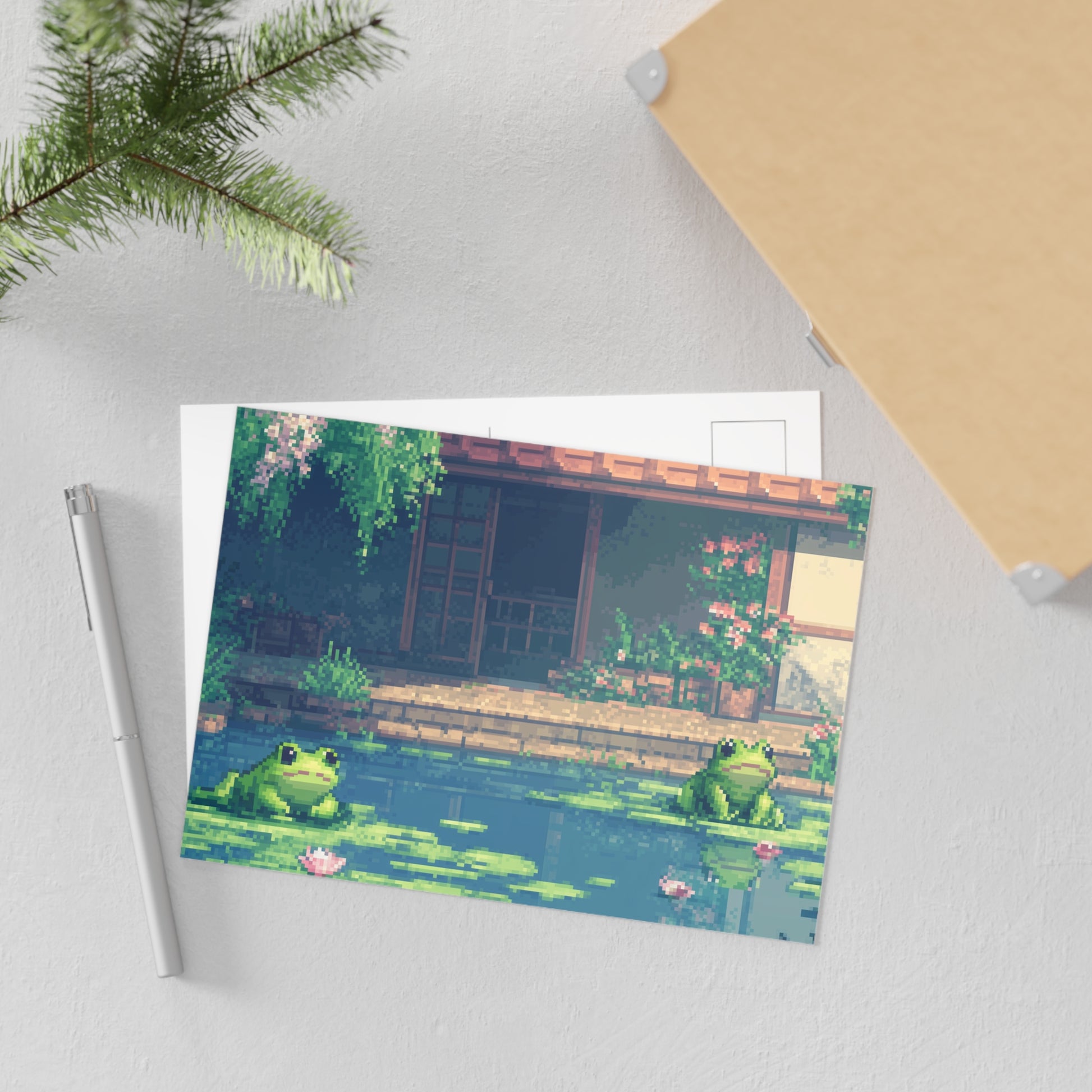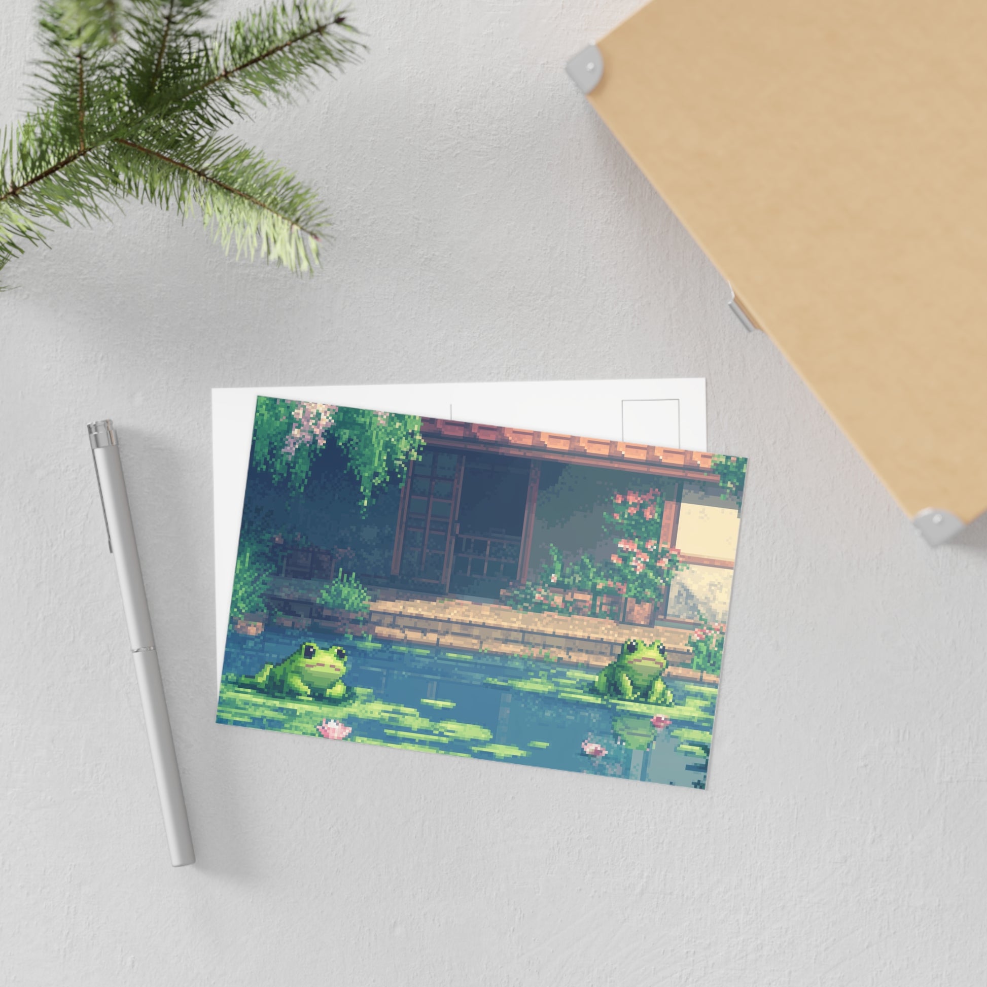 Send a peaceful escape with our "Kawaii Frogs" Postcards! Featuring adorable frogs relaxing in a serene pond, with a beautiful Japanese-style house in the background, these postcards evoke a calming, dreamlike atmosphere. Soft, tranquil colors and gentle details make this a perfect way to send a little peace, serenity, and a touch of nature’s beauty.