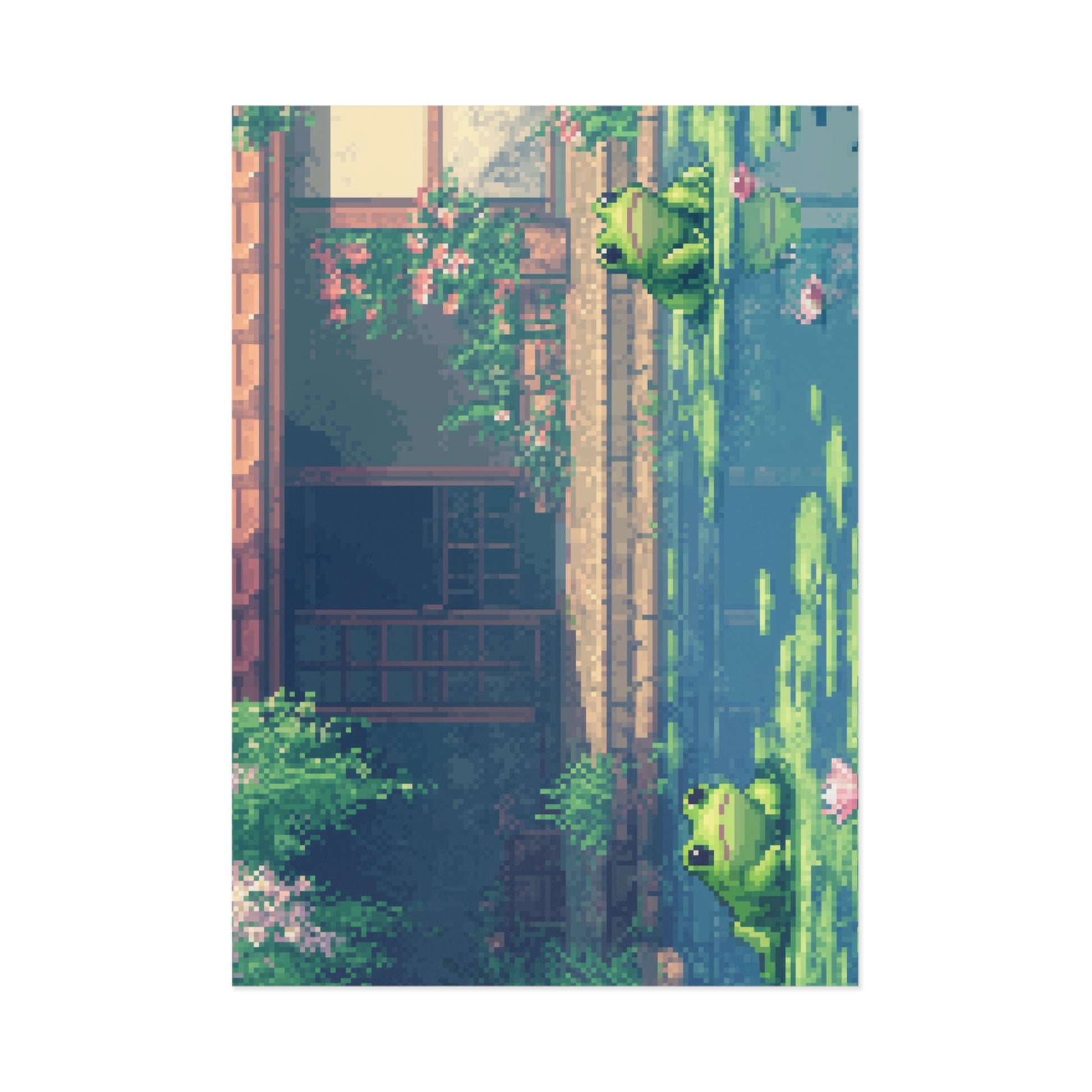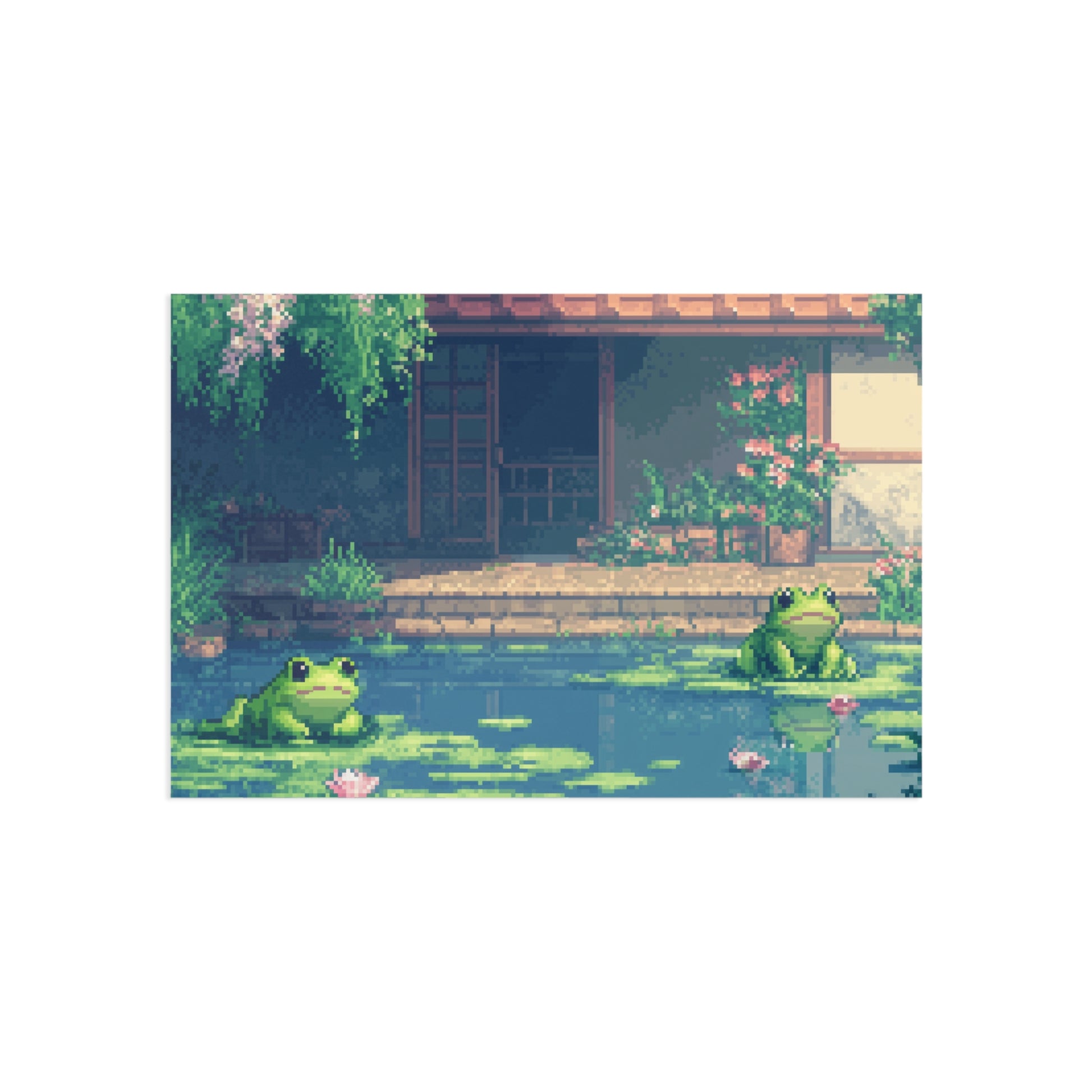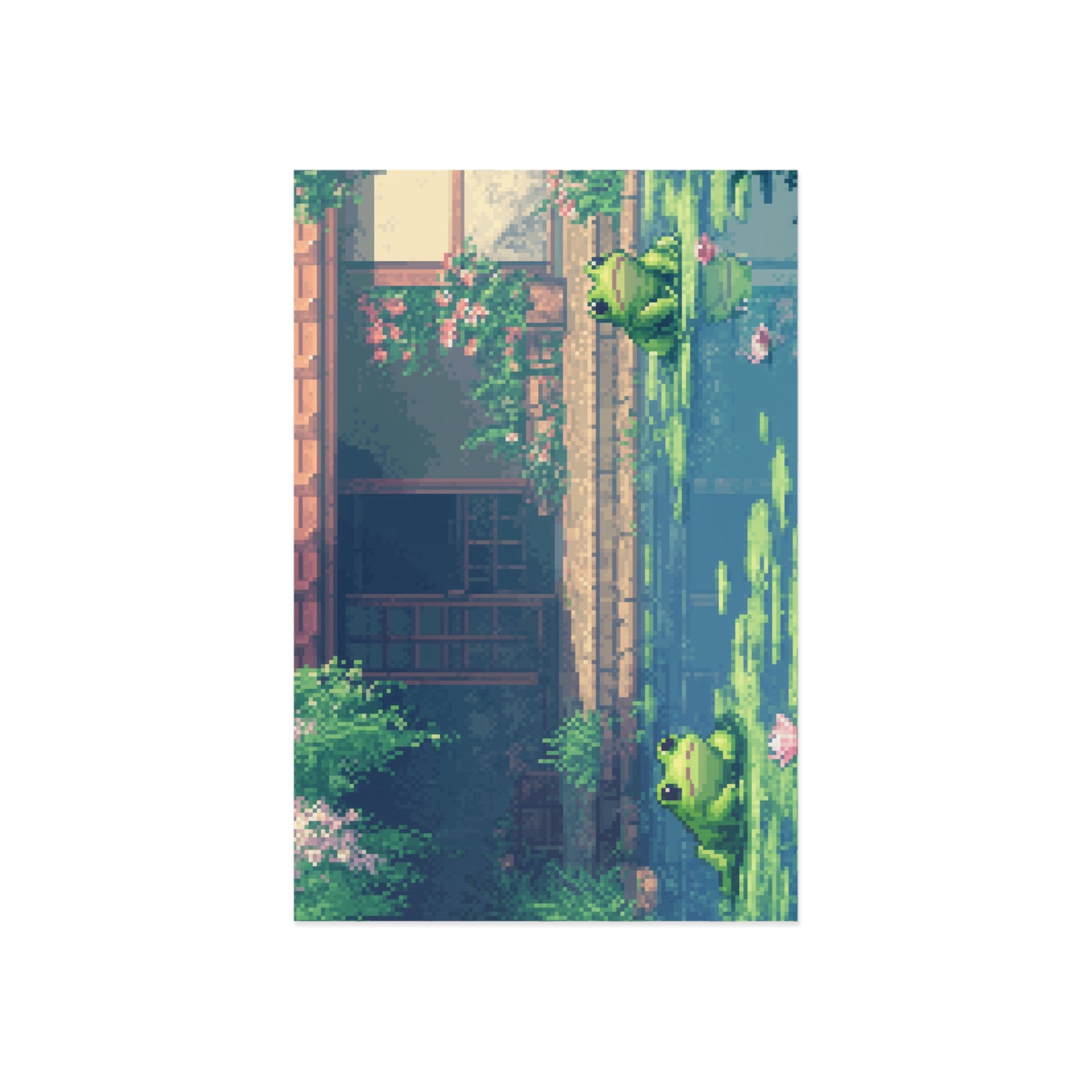 - Charming pixel art of frogs in a tranquil pond, with a Japanese-style house in the background