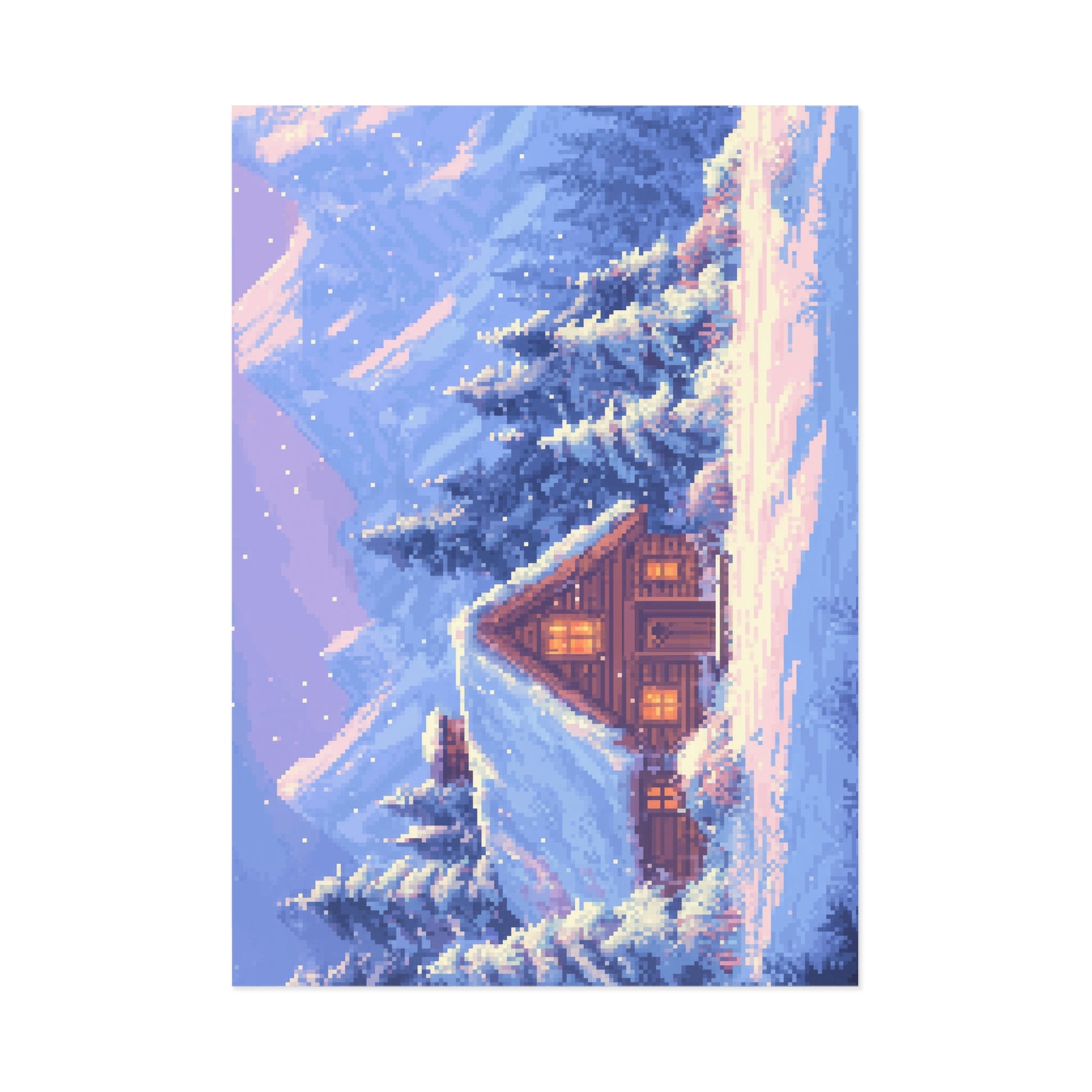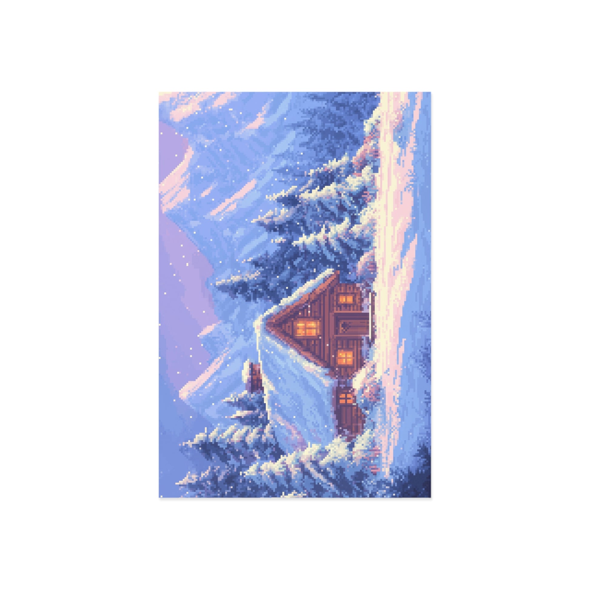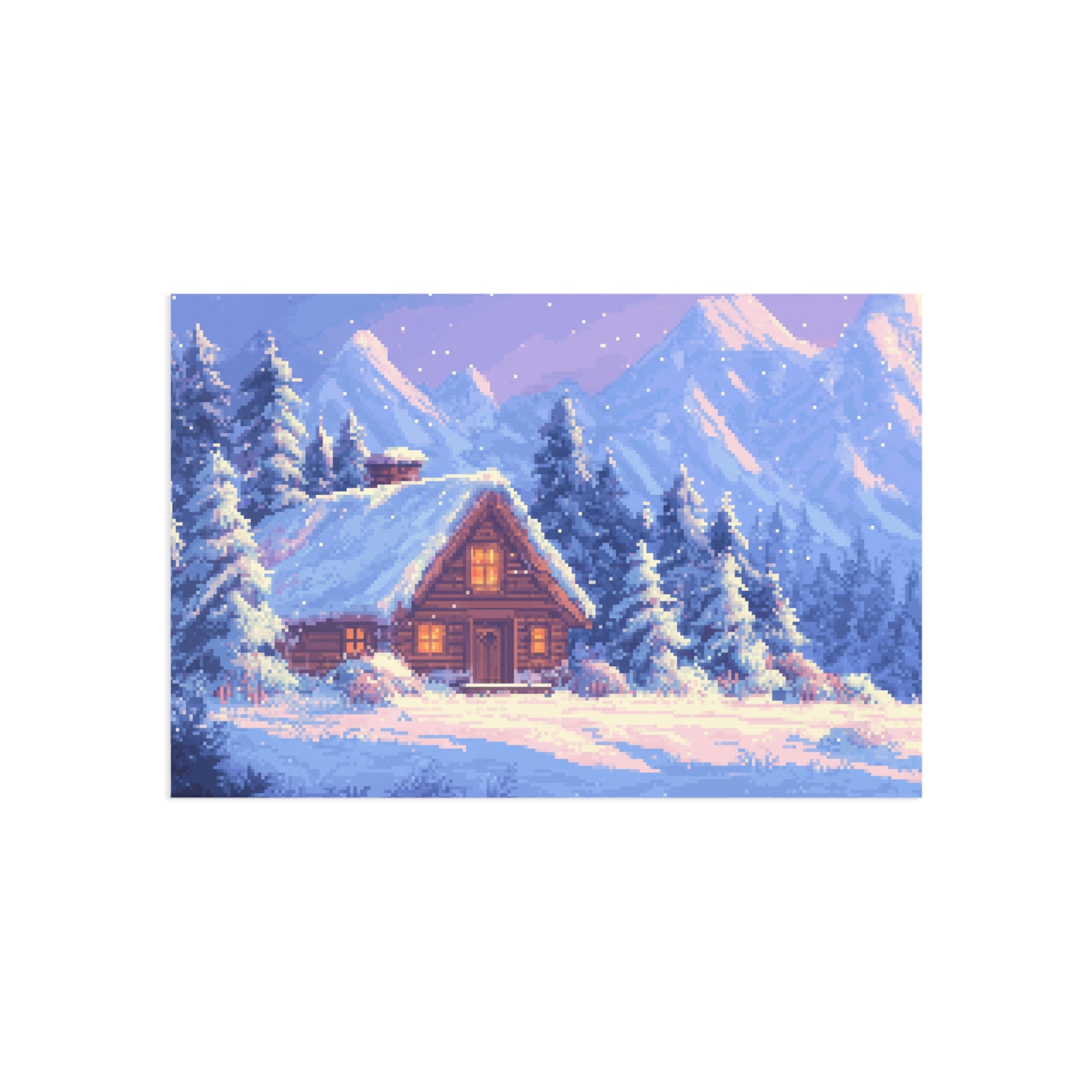 - Beautiful pixel art of a cozy cabin in a snowy forest with mountains in the distance
