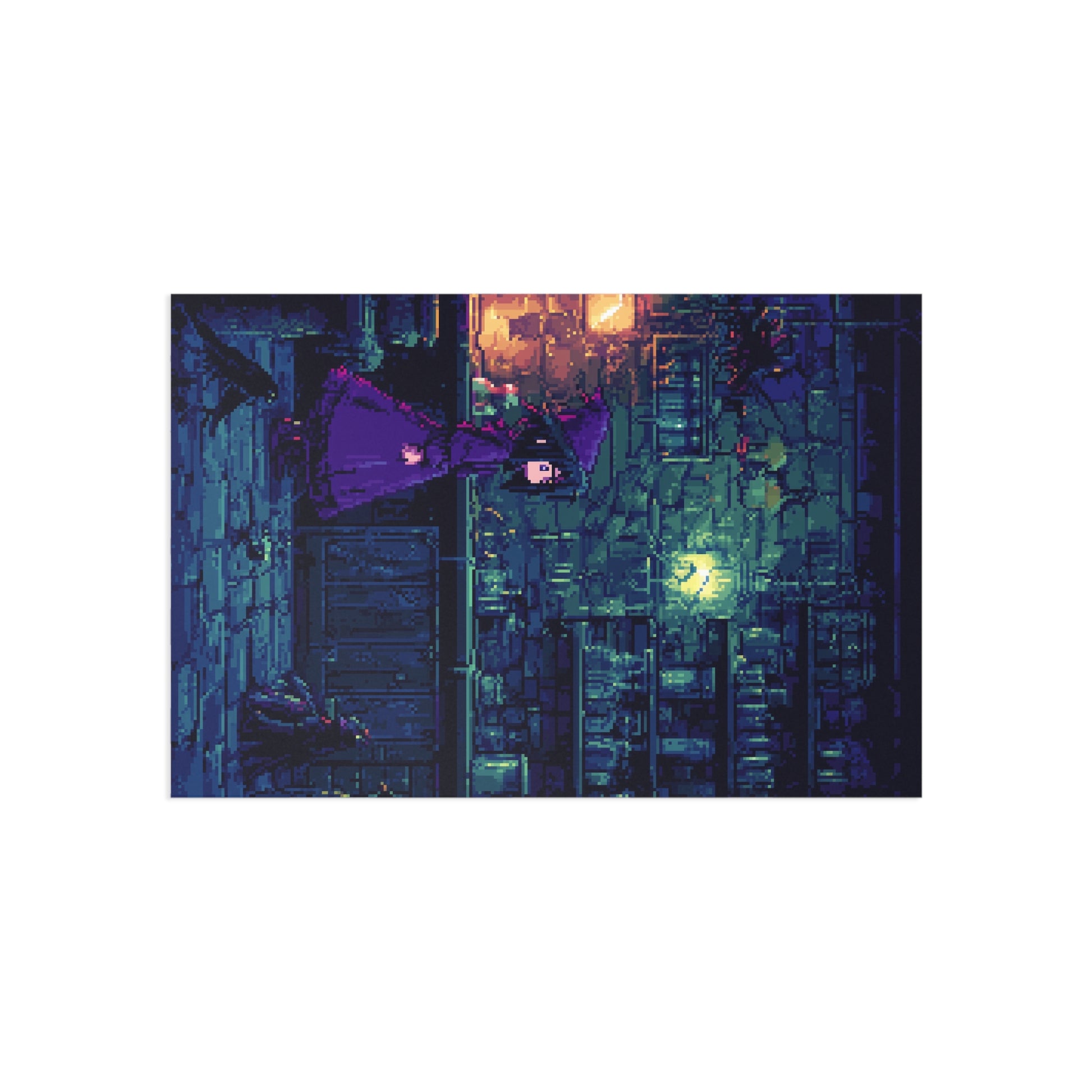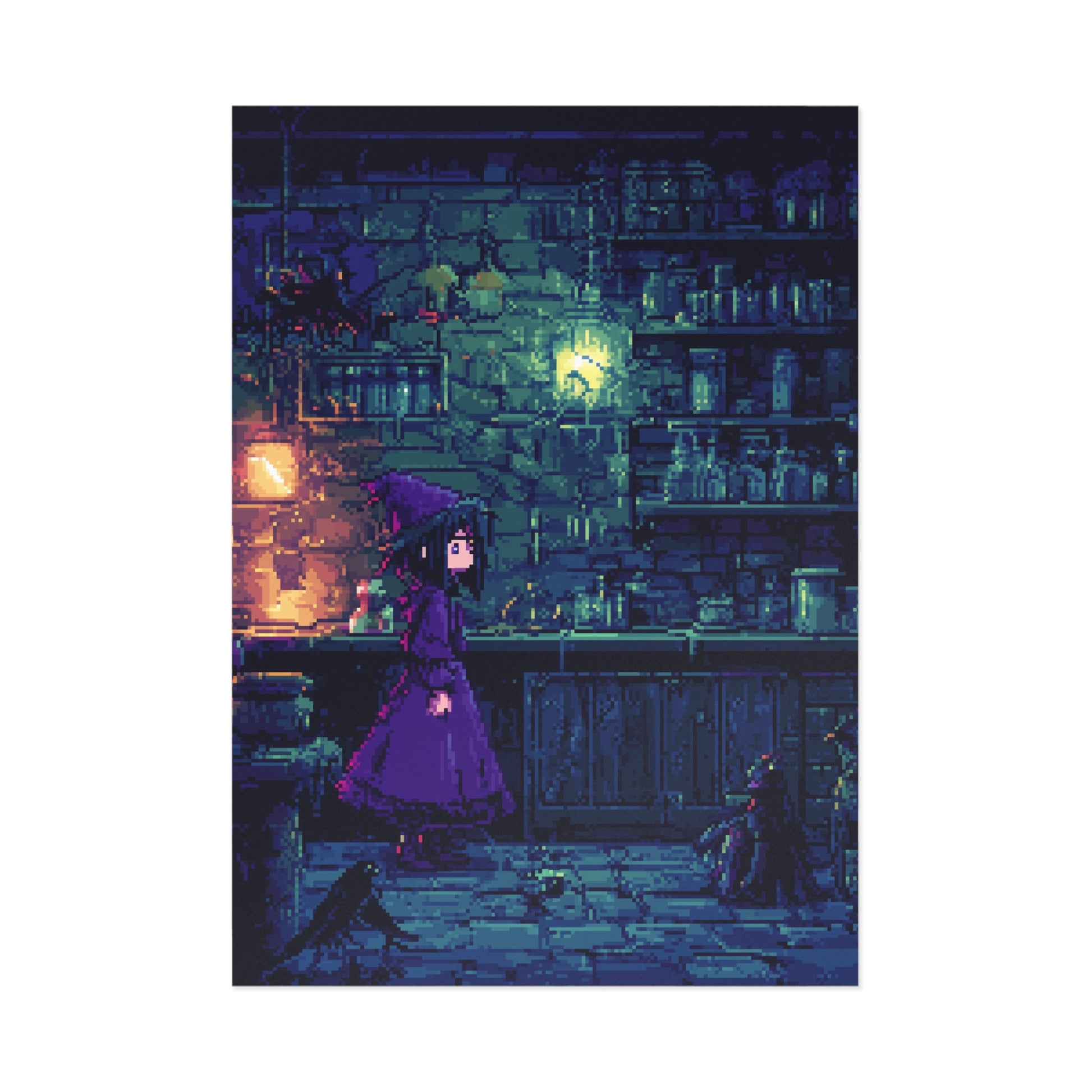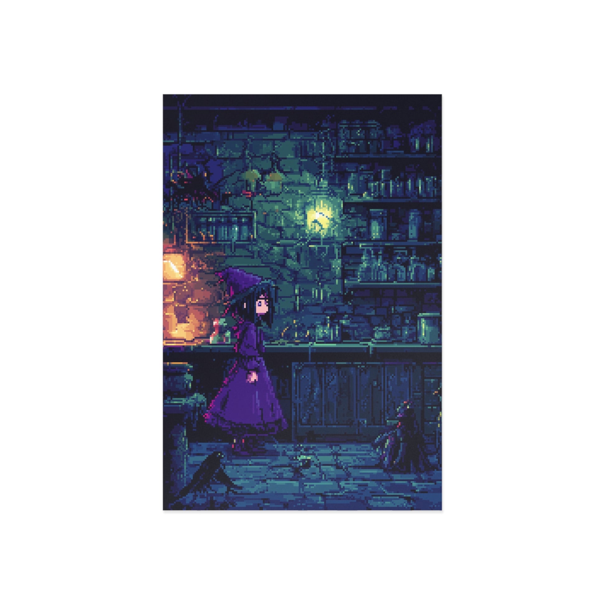 - Cute pixel art of a witch in her magical home with her friendly crows and potions